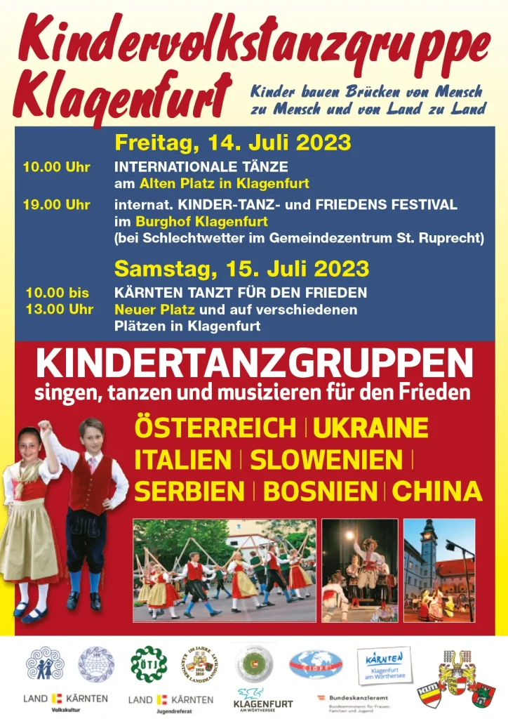 Festival 2023 Kärnten tanzt und plattelt für den Frieden!Samstag, 15. Juli 2023in Klagenfurt Vorheriger Beitrag Kindervolkstanzgruppe Klagenfurt am Freitag, 14. Juli und Samstag, 15. Juli 2023 Nächster Beitrag Das war…