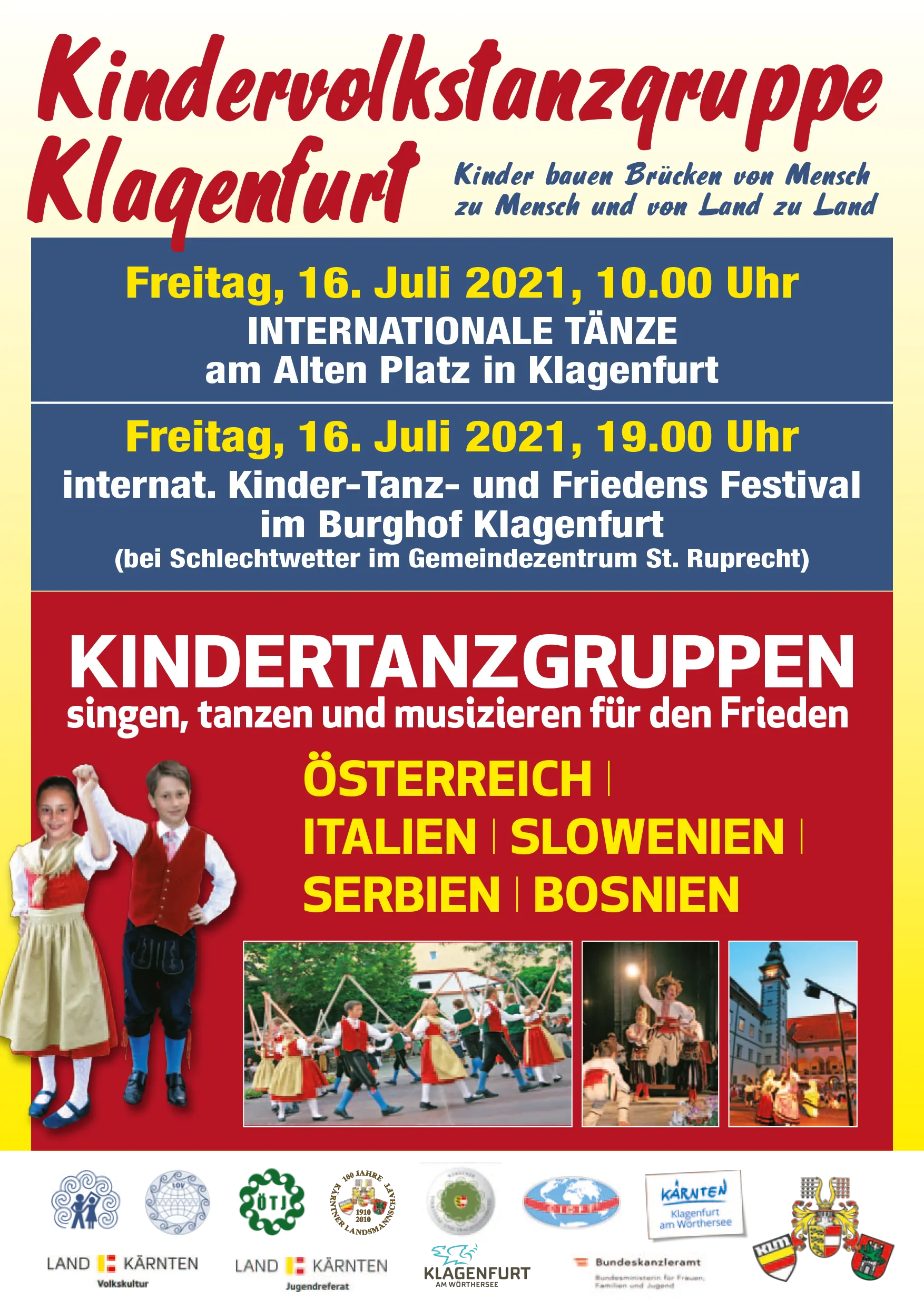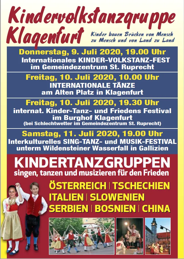 Freitag, 16. Juli 2021 19:00 Uhr – INTERNATIONALE KINDER-TANZ- UND FRIEDENS FESTIVAL im Burghof in Klagenfurt (bei Schlechtwetter, im Gemeindezentrum St. Ruprecht)